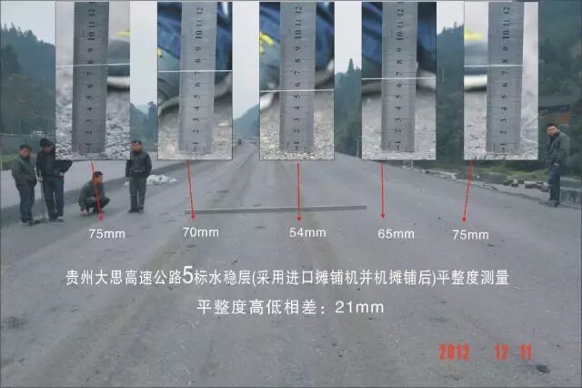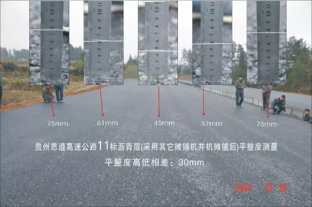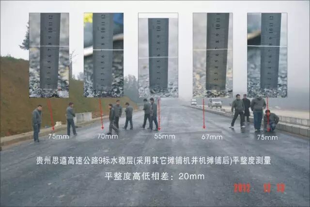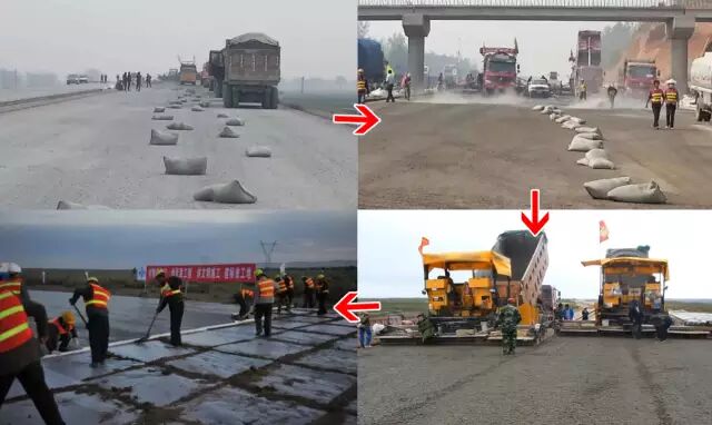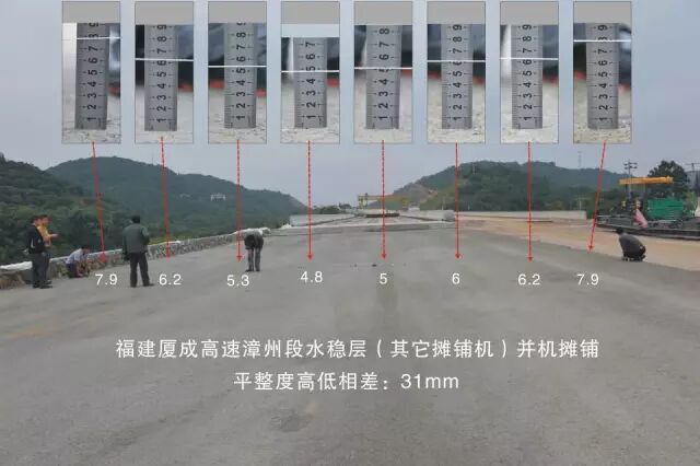 水稳层并机摊铺,形成“驴脊梁”,由于平整度不好,铺沥青时用大量沥青料来填补,俗称“用黑金补沙子”