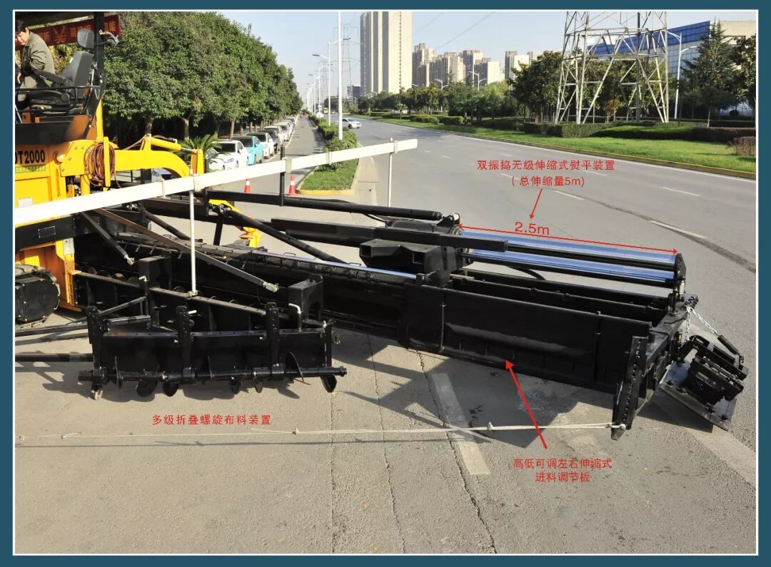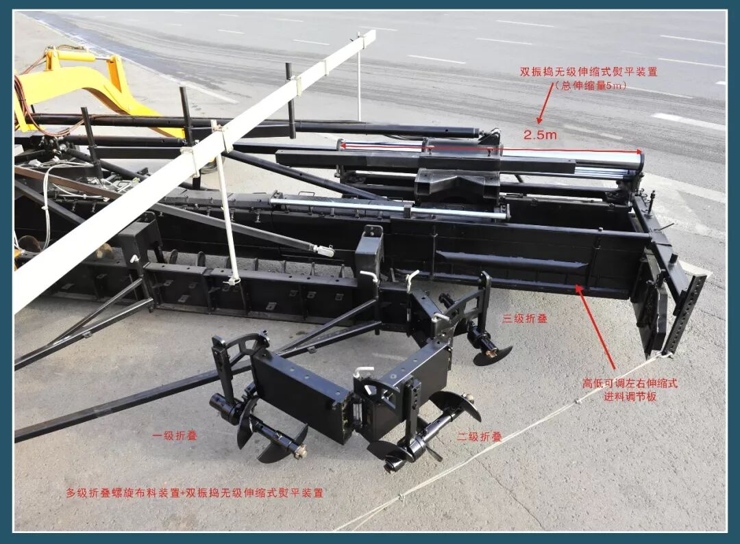 ①可多级折叠的布料装置+能无级伸缩的双夯锤振捣熨平装置