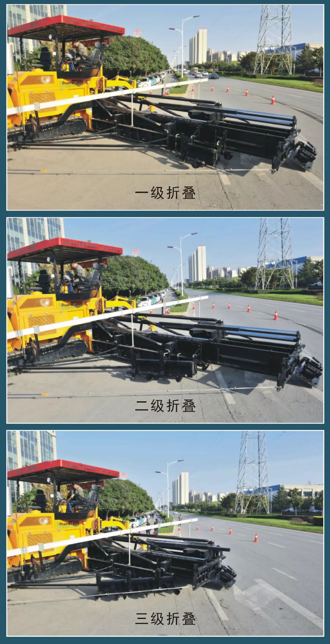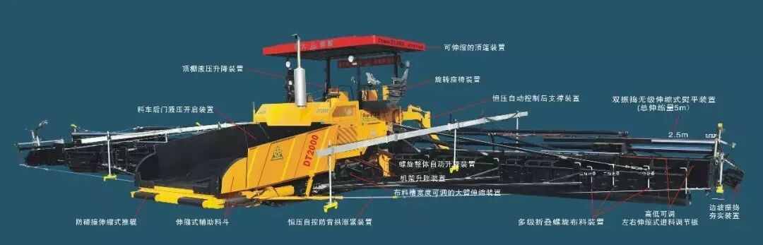 C、以多级折叠螺旋、无级伸缩双振捣熨平、动态变宽摊铺为主的变形金刚结构……