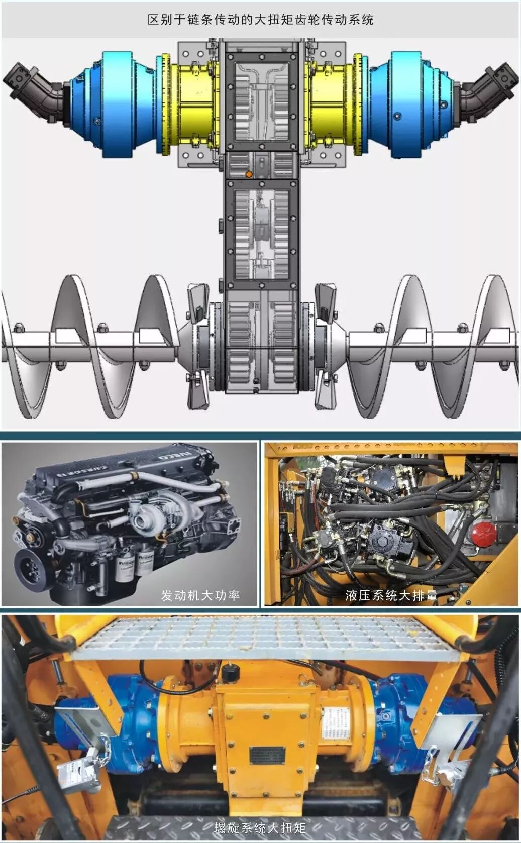 功率大、扭矩大,超级满埋螺旋均衡、连续、快速输料,摊铺效率高。